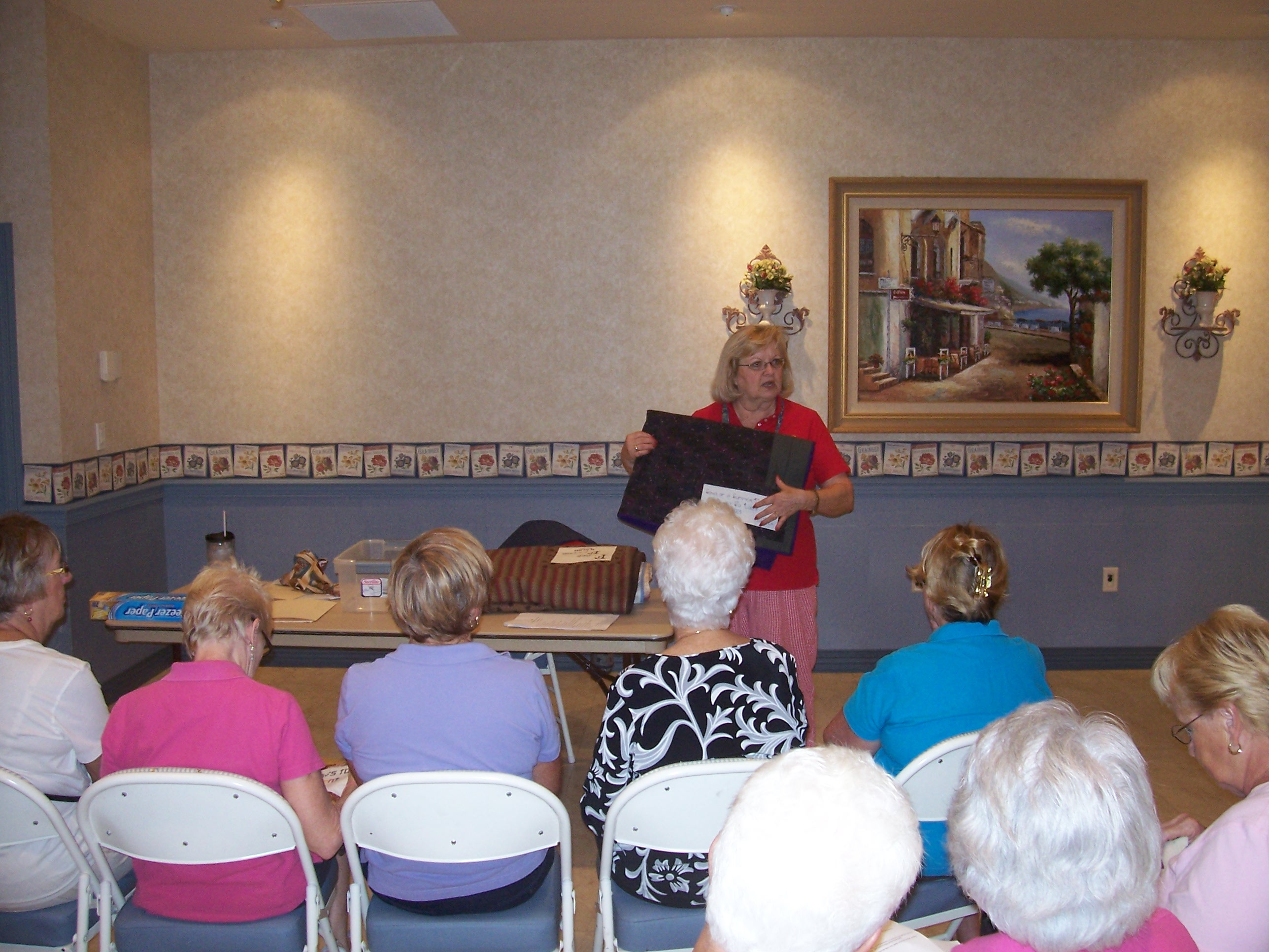 Micki MacCumber held a pre-meeting meeting with her Jump Start Block-of-the-Month group, to provide illustrations and discuss the various quilting techniques available to members for this important, almost last step to making a quilt.