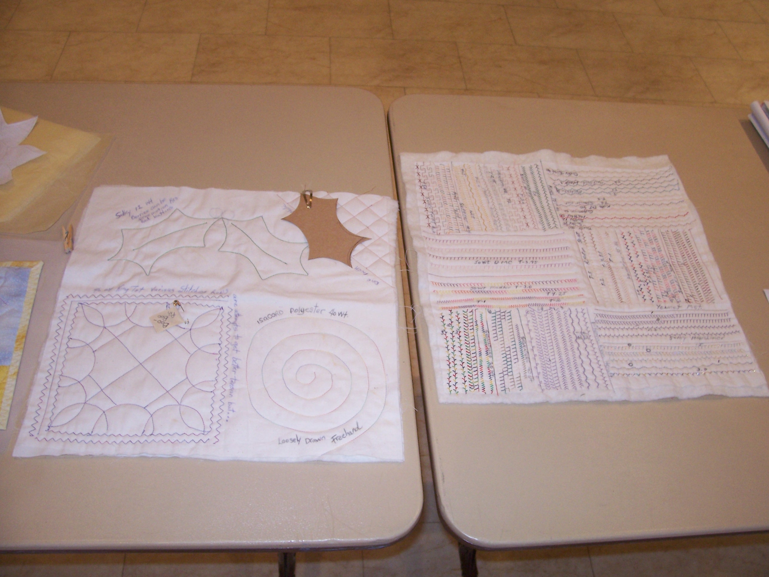 Micki MacCumber held a pre-meeting meeting with her Jump Start Block-of-the-Month group, to provide illustrations and discuss the various quilting techniques available to members for this important, almost last step to making a quilt.